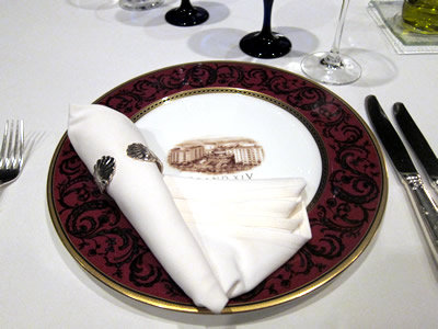 ショープレート(飾り皿)。ホテルの名前の入ったお皿と上質のナプキン、そしてそれを止めているナプキンリング。美しくセットされていました。