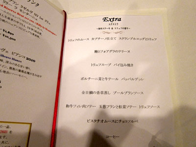 予約制なので最初にコースをオーダーしておくのが通常らしいのですが、僕らはオーナーに依頼して予約してもらったので、その場でコースを決めさせていただきました。コースは12,000円の「エクストラ」にしました。